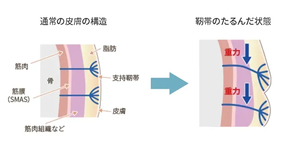 通常の皮膚の構造と支持靭帯のたるみ