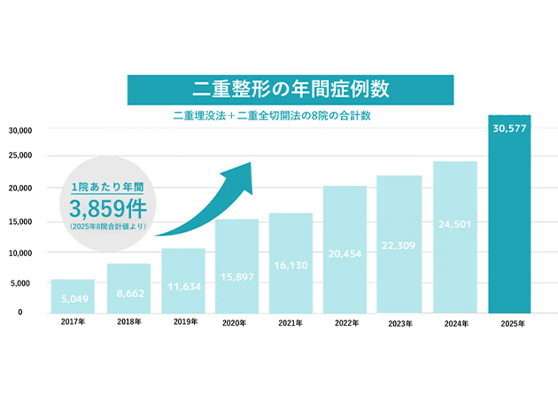 年間症例数30,577件※2025年8院二重整形合計施術数