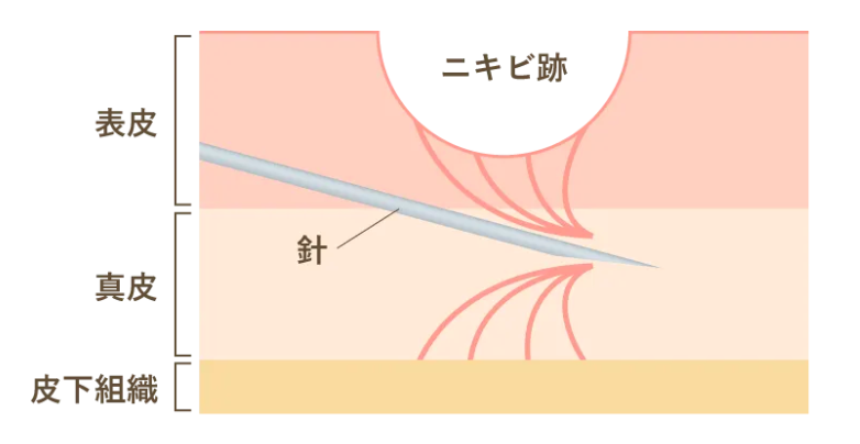 ニキビ跡などによりクレーター状になっている皮膚の下にある固い癒着組織を針で切り、凹みを改善する治療法